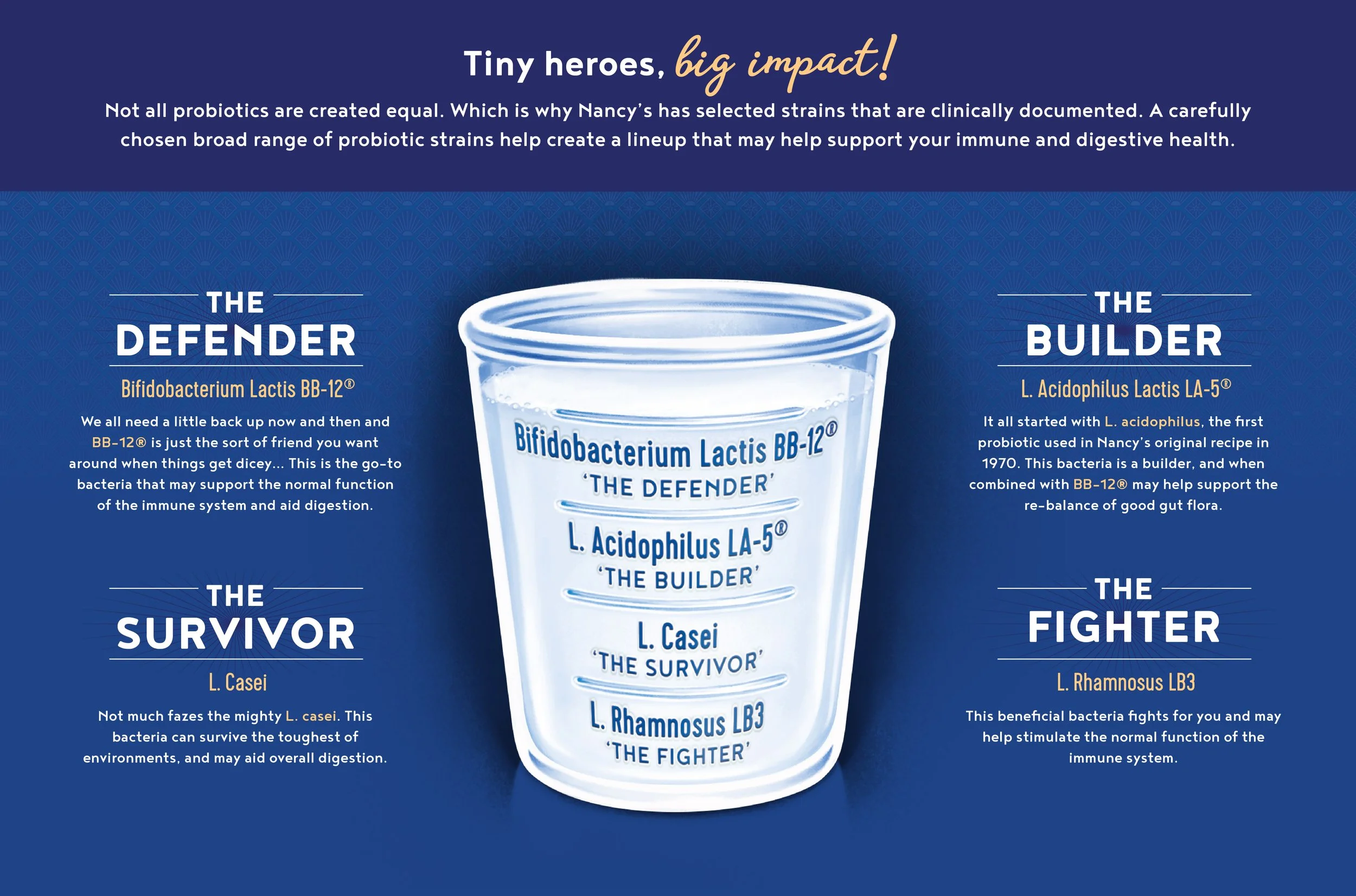 Nancy’s has more probiotics than other dairy products by a mile—but describing the benefits of healthy gut flora can get real scientific, real fast. To help differentiate the pioneering natural foods makers in a packed dairy aisle, the family brand needed copy to balance their scientific acumen and hippie vibe—without flying over the head of an average consumer looking over labels in the dairy aisle.